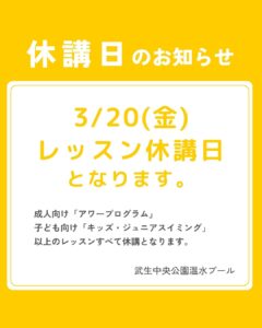 3月20日(金)レッスン休講のお知らせ 2026年3月17日 最終更新日時 : 2026年3月17日 01inc-admin ■ 3月20日(金)レッスン休講 3月20日(金)はレッスン休講日となります。 成人向け「アワープログラム」 子ども向け「キッズ・ジュニアスイミング」 以上のレッスンすべて休講となります。 武生中央公園温水プール